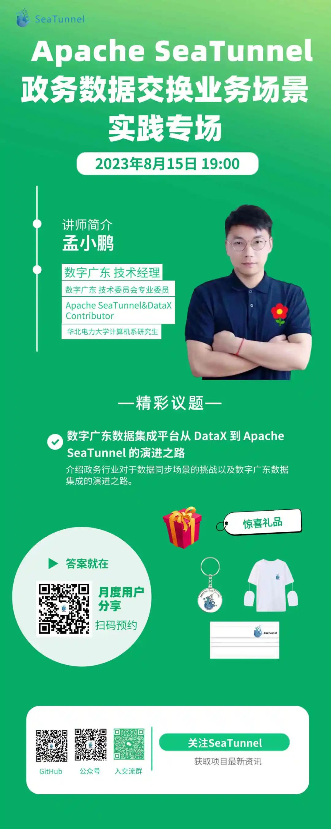 政务行业在数据交换的业务场景上面临哪些挑战?如何利用 Apache SeaTunnel 数据集成技术支持实现数据价值的最大化?2023 年 8 月 15 日 19:00,来自数字广东的专家将现身 Apache SeaTunnel 用户线上分享 Meetup,介绍政务行业数据共享交换业务场景面临的挑战以及数字广东的数据集成技术演进之路。