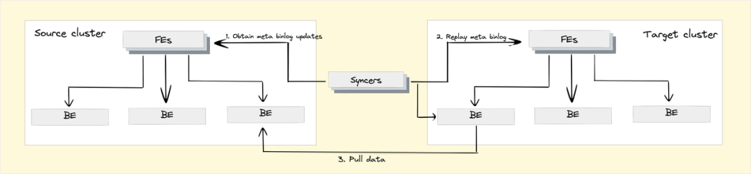 在 Apache Doris 2.0 版本中,我们引入了 Binlog 机制来追踪数据的修改记录,包括 Meta Binlog 和 Data Binlog。为了实现集群间的数据同步,我们引入了外部组件 Syncer ,通过 Syncer 获取到最新的 Binlog 并回放到下游集群来实现数据的同步,同时增加了一系列机制来清理多余 Binlog。具体实现包括:
