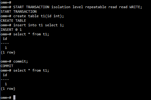 `openGauss=# begin;BEGINopenGauss=# insert into t select 2;INSERT 0 1openGauss=# select * from t;id12(2 rows)$ gsqlgsql ((openGauss 5.0.0 build a07d57c3) compiled at 2023-03-29 03:07:56 commit 0 last mr )Non-SSL connection (SSL connection is recommended when requiring high-security)Type “help” for help.openGauss=# select * from t;id1(1 row)`
