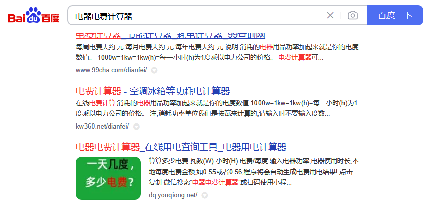 打开浏览器,百度搜索“电器电费计算”如下即可找到很多的在线工具。