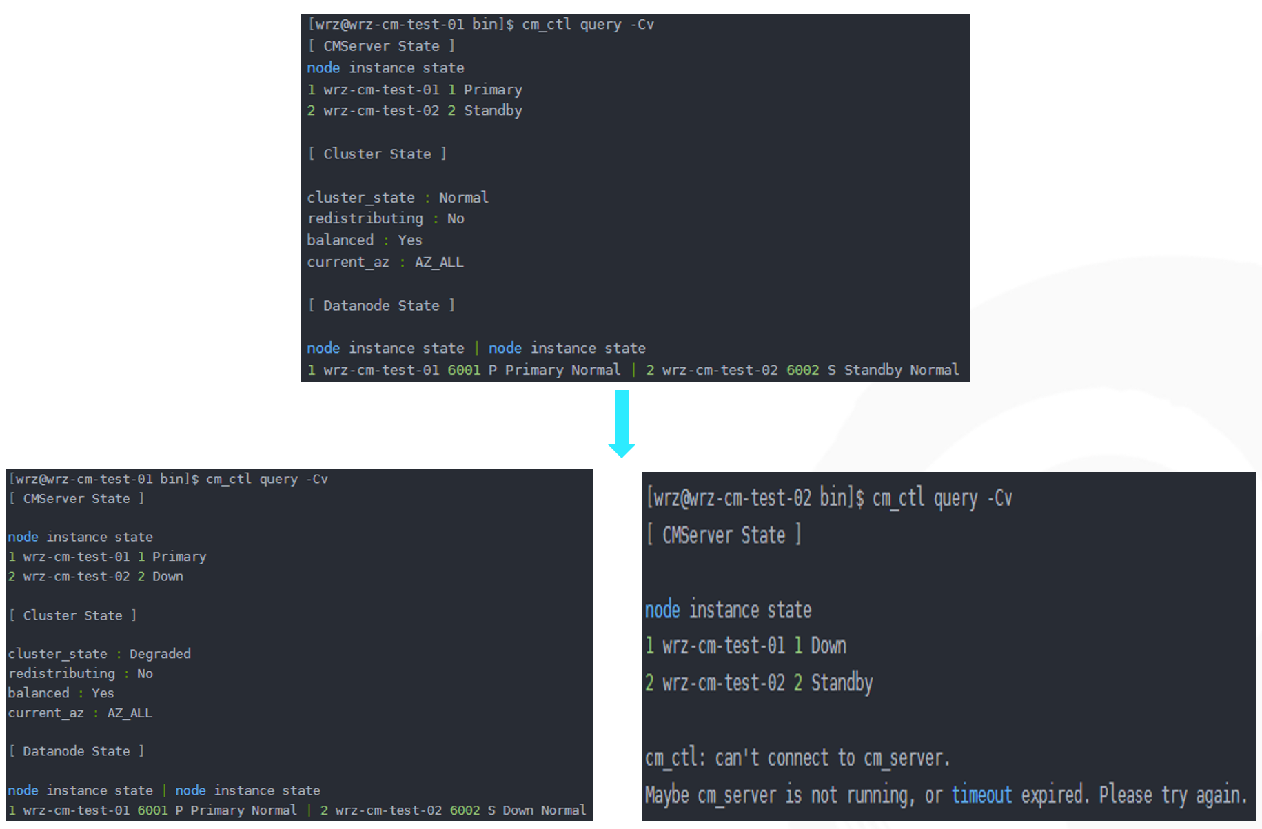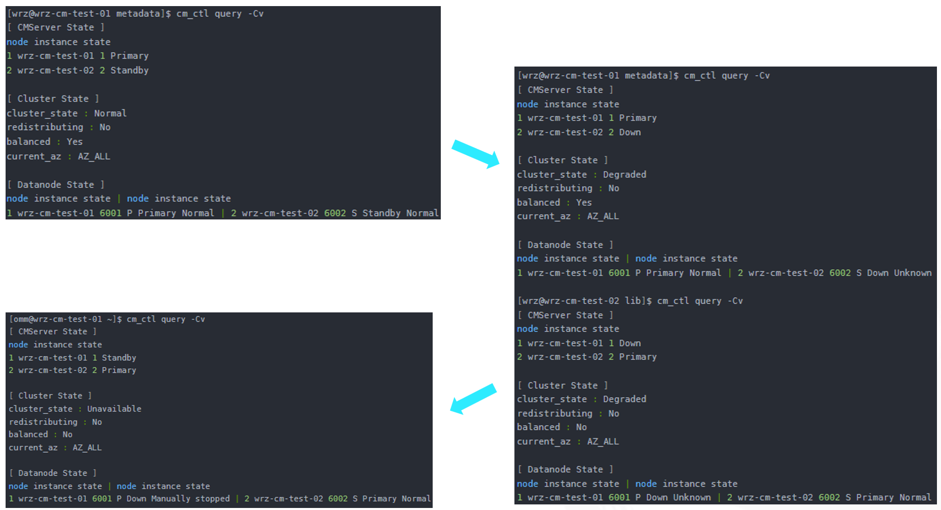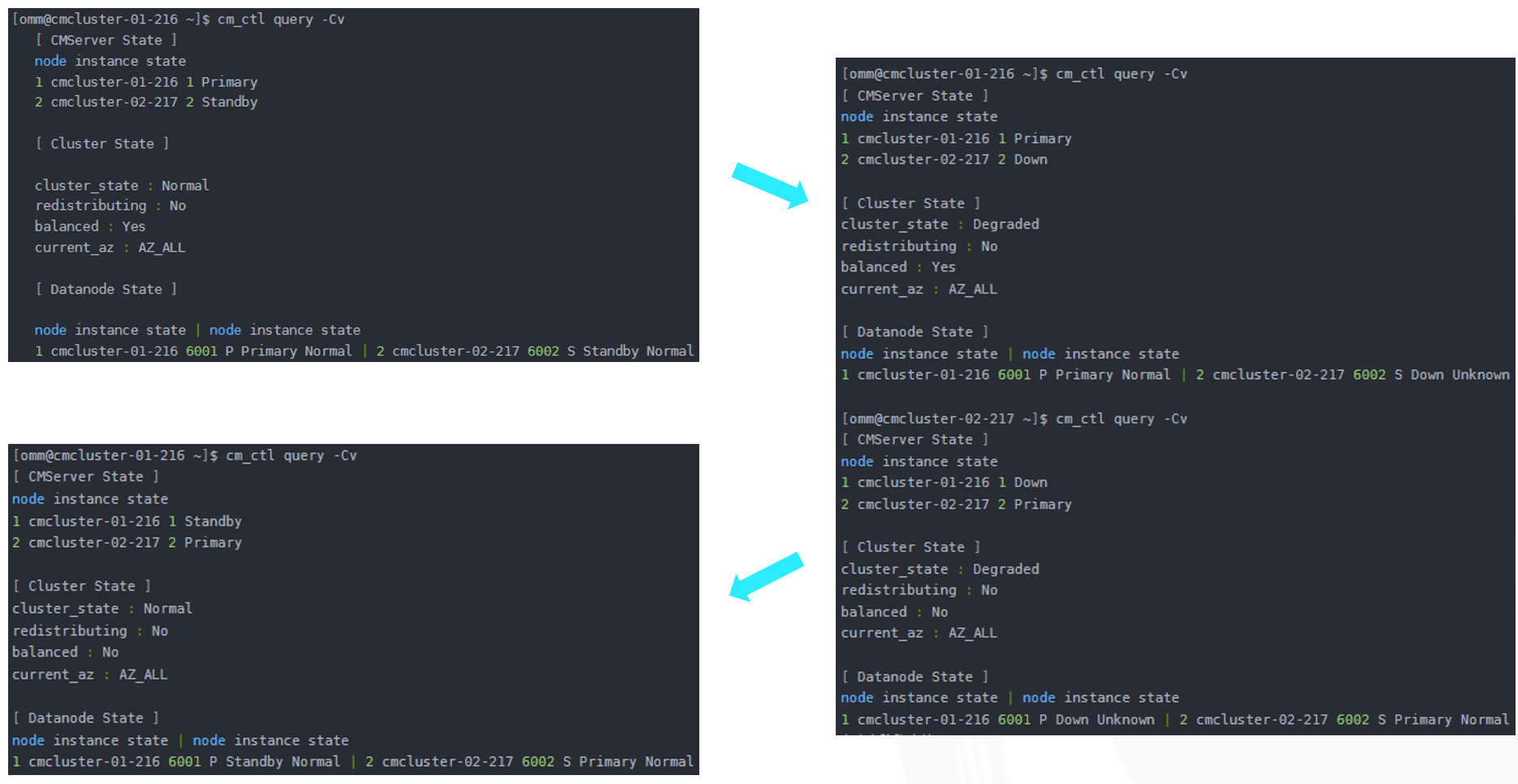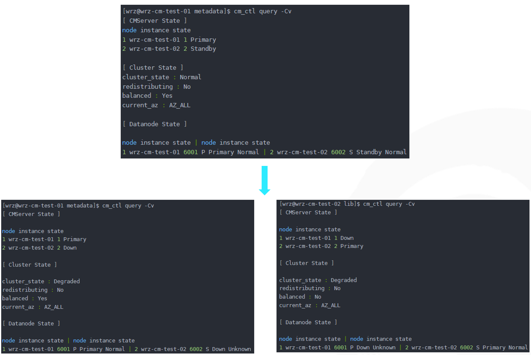 1. cms_enable_failover_on2nodes=true, third_party_gateway_ip配置为有效IP,cms_enable_db_crash_recovery = on;2. CM集群脑裂故障且完成自动故障恢复;
