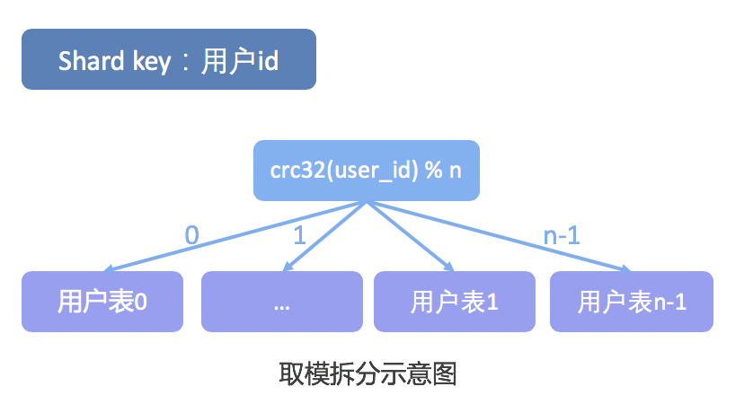 取模拆分:根据数值取模。当字段为数值类型,直接取模;当字段为字符类型,则通过哈希算法计算出数值,再取模(微保采用的是CRC32算法)。