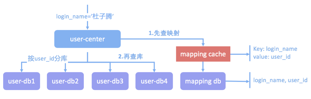 拿用户体系为例,我们选择了user_id 做Shard key,当业务想通过login_name进行查询,先查找映射表,通过登录名查出user_id,再通过路由去查用户库。