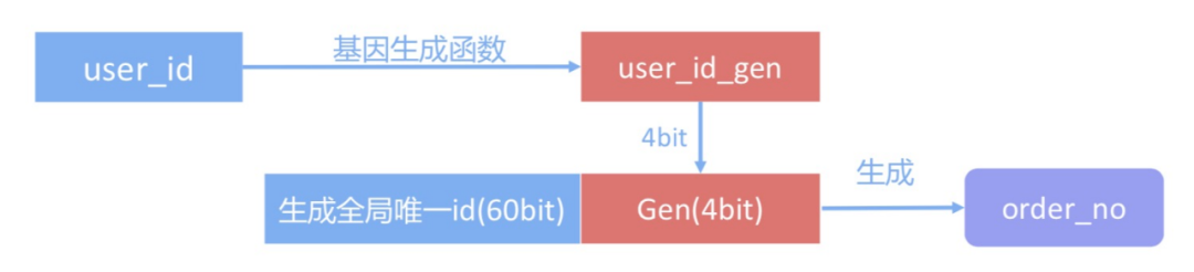 比如订单号和user_id,我们可以把user_id的一部分(gen) 揉进订单号里,我们按照user_id 分库分表的话,订单号也已经确定分库分表的位置。如上图,如果采用这种基因法,就必须分16个表,因为是Gen为4bit。