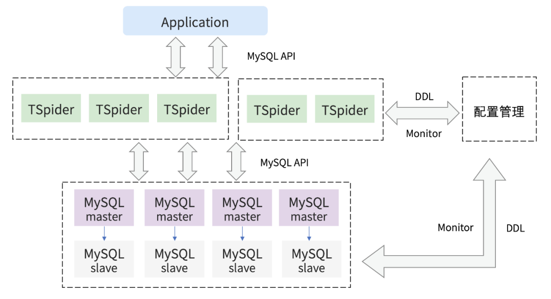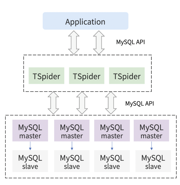 从架构图中可以看出,应用程序连接TSpider,TSpider充当中间件,将客户端查询的请求,按事先定义好的分片规则,分发给后端数据库,之后返回的数据在TSpider内存里做聚合,最后返回给客户端请求。