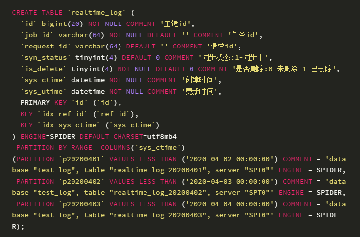 其中p20200401分区则表明对应的实际逻辑库为test_log,逻辑表为 realtime_log_20200401 , 对应的后端数据库别名为SPT0。