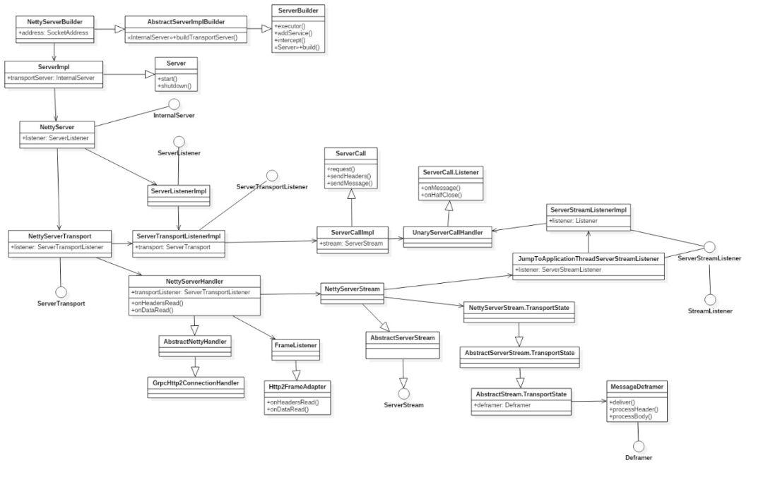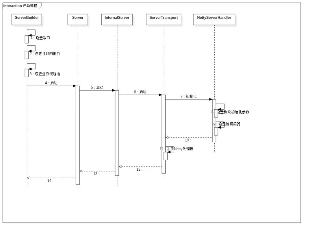 gRPC的线程机制上有很多Netty线程池和业务线程池之间的切换,所以需要有非常多的监听器注册。时序上省略这些注册链路,实际上这部分依赖关系很复杂。后文介绍线程模型时会有所涉及。