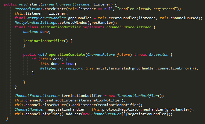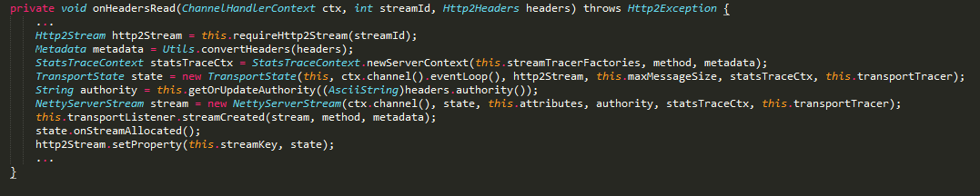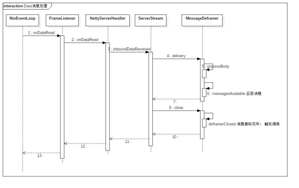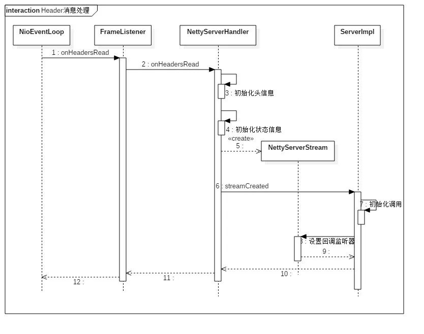 FrameListener是NettyServerHandler在初始化流程中向Netty注册的一个解码器。当Header消息到来时,Netty的处理线程会触发FrameListener的回调。Header消息是一个请求的开始,接收到Header消息后会初始化当前这个流,并且设置好Metadata。