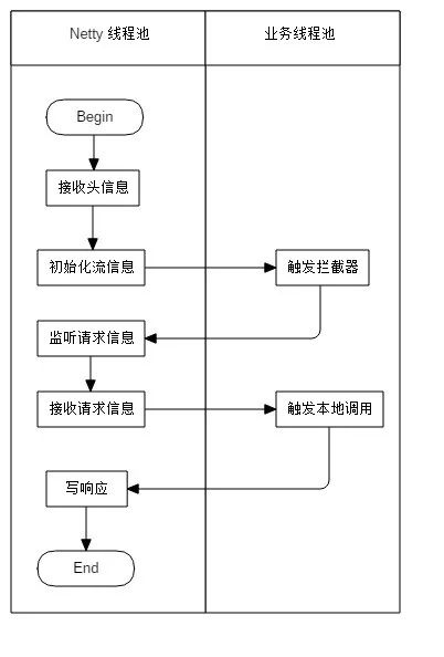 请求接收完毕后,会设置标识endOfStream, 关闭解码器,会触发到真正的本地调用。本地调用会切换到业务层的线程池进行。