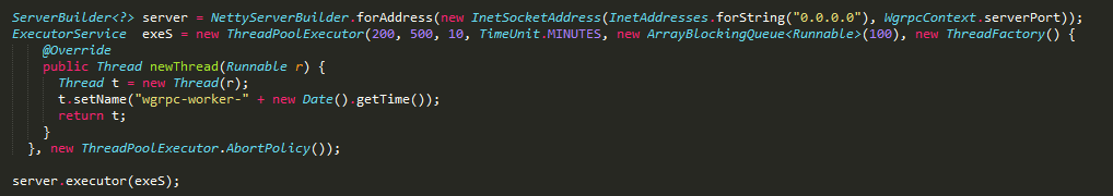 ServerBuilder提供了基础方法让我们能够在启动的时候注册业务线程池,并且自定义我们想要的线程池大小,扩展策略,拒绝策略。
