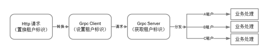 业务层主要依据接入层传入的租户标识来实现业务逻辑的处理,微保客服平台内部服务统一使用GRPC实现微服务之间的调用,结合此框架的特性,网关把HTTP转GRPC请求时,我们把租户标识设置于请求的header里,当服务端接收到请求后,读取header里的租户标识,即可做相关业务逻辑的判断处理。
