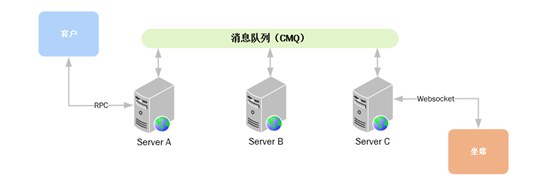 客服平台在坐席侧是通过websocket长连接实现消息互通的,其实就是一款在线的IM,在集群部署的情况下,客户的会话消息可能会调用任一服务结点,而坐席登录时也有可能连接任一服务结点。客户与坐席是有状态的消息互通,那我们就需要把有状态的服务,改造成无状态的服务,通过中间件实现状态的解耦。实现中我们采用了腾讯云的消息队列CMQ,实现状态的解耦,具体方式是如下: