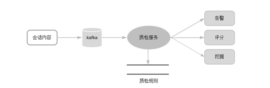 坐席平台在收到会话内容后,首先推送至kafka中,质检服务负责消费kafka中的会话内容;根据预先定义的质检规则,针对敏感词汇、违规内容发送业务告警。主管人员或系统自动结合上下文分析,对客服的回复质量进行评分及统计。
