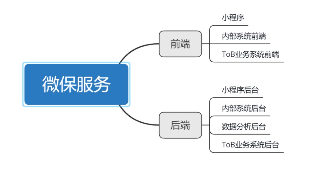 微保的服务可以笼统的分为前端服务和后端服务两类,其中微信小程序是面向C端的主要入口,但实际上是托管运行在微信的后台,不涉及到容器化的事项,所以也不在本文的讨论范围内。