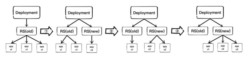 得益于Deployment声明式的资源管理方式,在更新一个应用的时候我们只需要修改编排文件中的image字段即可触发应用的滚动更新,具体更新过程如下: