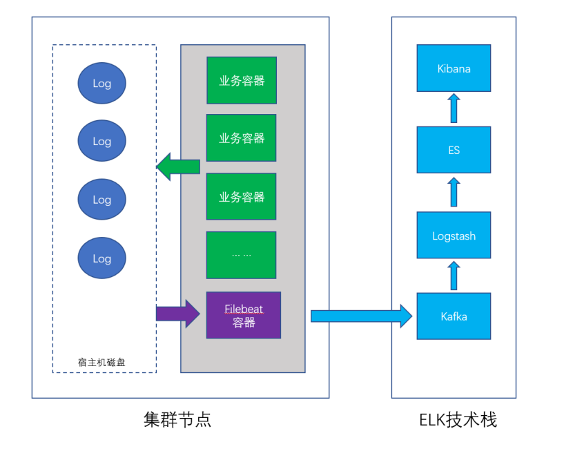 最终经过测试和权衡,我们选择了方案二,测试过程中发现只要保证日志采集实例的资源充足,filebeat运行的稳定性还是没有问题的,从一年多的线上运行经验来看这种方案也足够稳定。最终的日志采集上报架构图如下: