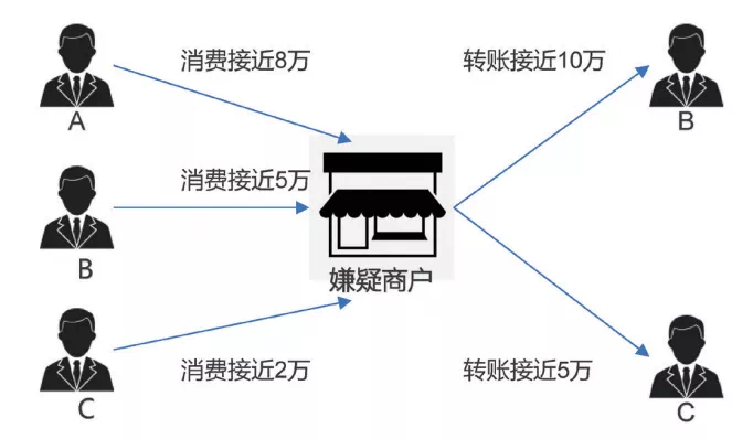 例如图2所示的套现团伙侦测,当犯罪团伙通过多张信用卡交叉转账的方式避开了现有监测体系时,通过上述多部图模型得到的套现嫌疑子图可以侦测出这种套现模式。客户A与其关系紧密的客户C在某商户消费共计10万元,商户将资金转给客户B,同时客户B也在该改商户消费5万元,商户将资金转给客户A或客户C。