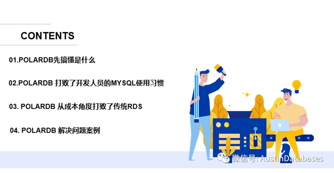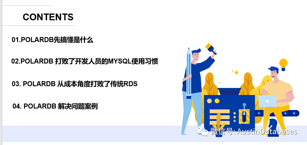 在开始今天的分享我们先需要了解今天主要的分享的内容,主要分为4个部分,分别为 POLARDB 是什么,POLARDB 怎么改变了开发人员对于使用数据库的习惯,POALRDB 从成本的角度征服了谁 以及POALRDB 实际的使用中的解决问题的案例。