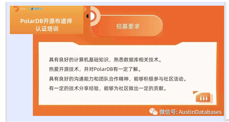 在分享之前,这里做一个免费的公益广告,如同POSTGRESQL 业界的大佬 “德哥”的标签,公益是一辈子的事情,基于德哥一直在为POLARDB开源版本工作,这里我们有一个POALRDB 开源方面的认证,,如果大家有兴趣可以参加。