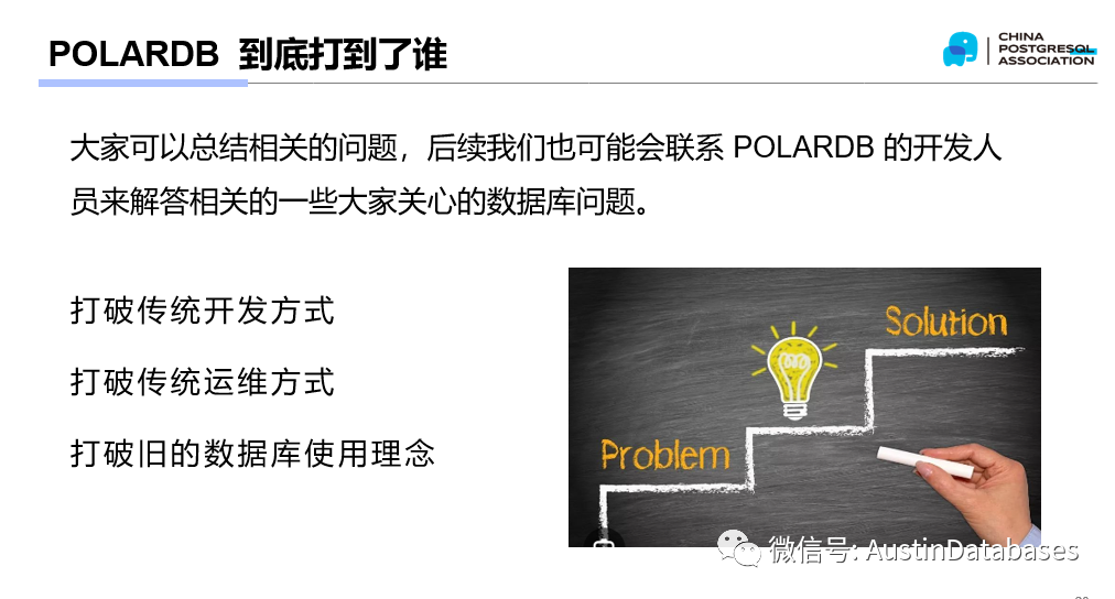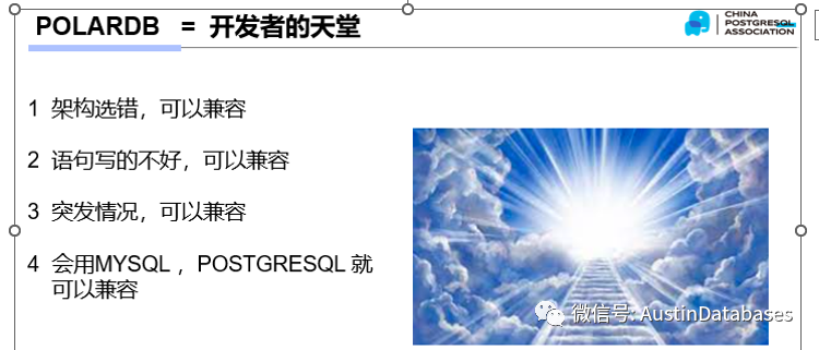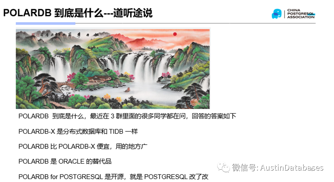 为什么这样说,基于我们数据库分享群中以及在其他的一些比较大的群中,对于POLARDB 是什么的一些回答,我们也可以看出,的确是很又意思,基本上都在摸大象,众人摸POLARDB 就是这样来的。基本上没有说稍微完整的。
