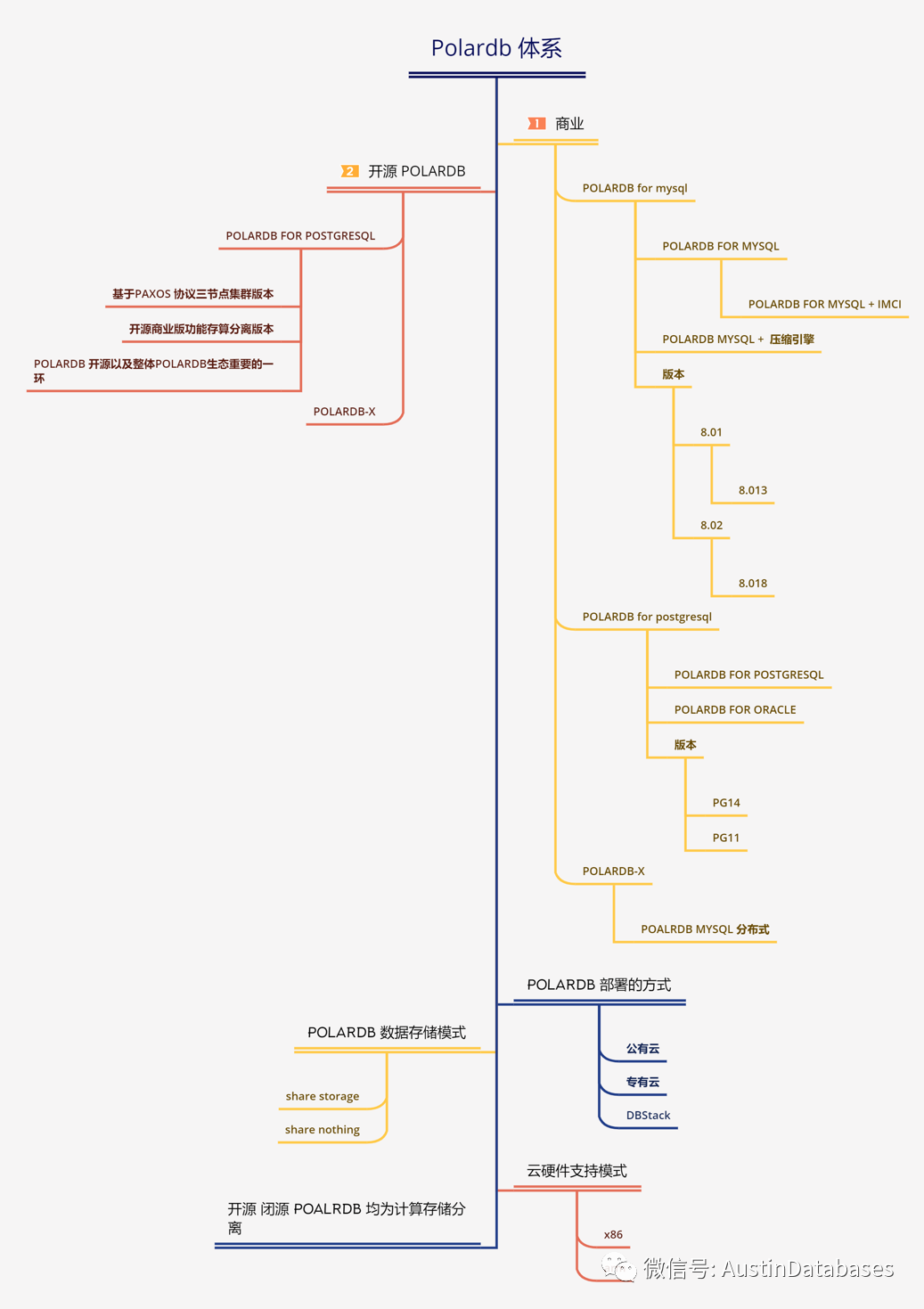 到底什么是POLARDB, POLARDB 是一个数据库的名词,还是一个品牌,这是我们需要搞清楚的。下面是一张我绘制的POLARDB 的体系图,从图中可以看出,POALRDB 本身不是一个数据库,是一个群体数据库的统称,或者可以称之为一个体系,所以把POLOARDB 单独认为是一个数据库的看法,想法,认知是不完整的。
