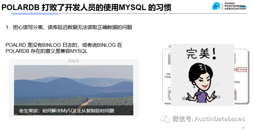实际上如同我前面提到的,打败康师傅的不是统一,是外卖,POALRDB 打败的可能也不是一个具体的数据库,而是一种数据库的使用习惯。我们以我们习以为常的开发中,经常DISS MYSQL的读写分离实现困难的问题来说。因为什么,因为异步,因为你不知道你任何一刻的主库和从库的数据是否是一致的,应用程序必须通过业务的逻辑判断,这就导致应用程序还要承担一部分基础设施需要的工作,所以这样的结构,必然是遭人嫌弃。
