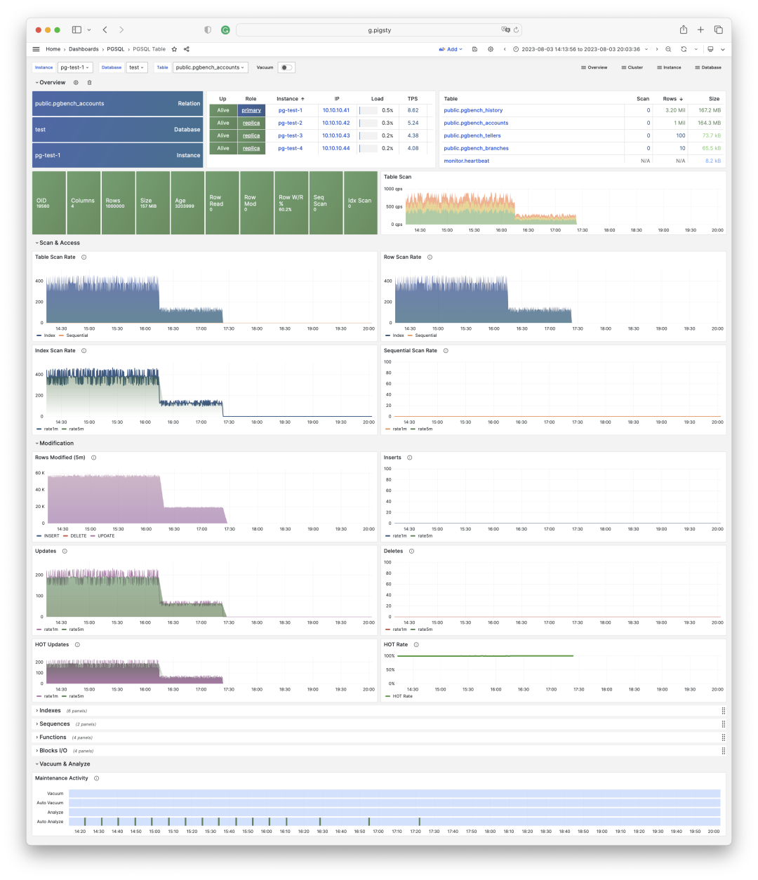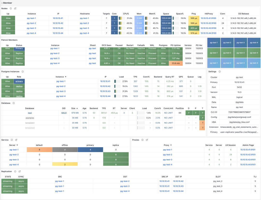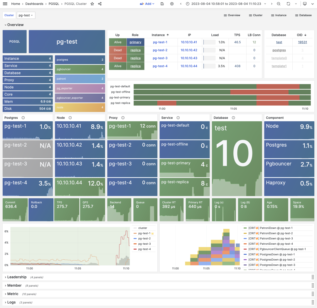 当然,老式的导航表格可以提供更丰富的信息,也并没有移除,而是移动到了专门的 Instances Members 分栏中去。让我们以最常用的 PGSQL Cluster 面板为例: