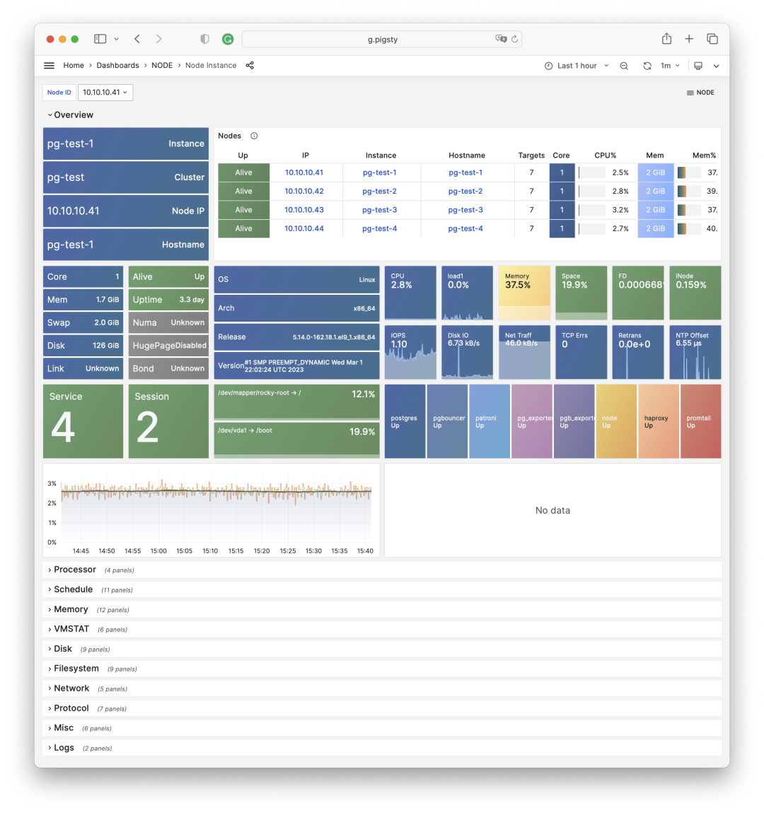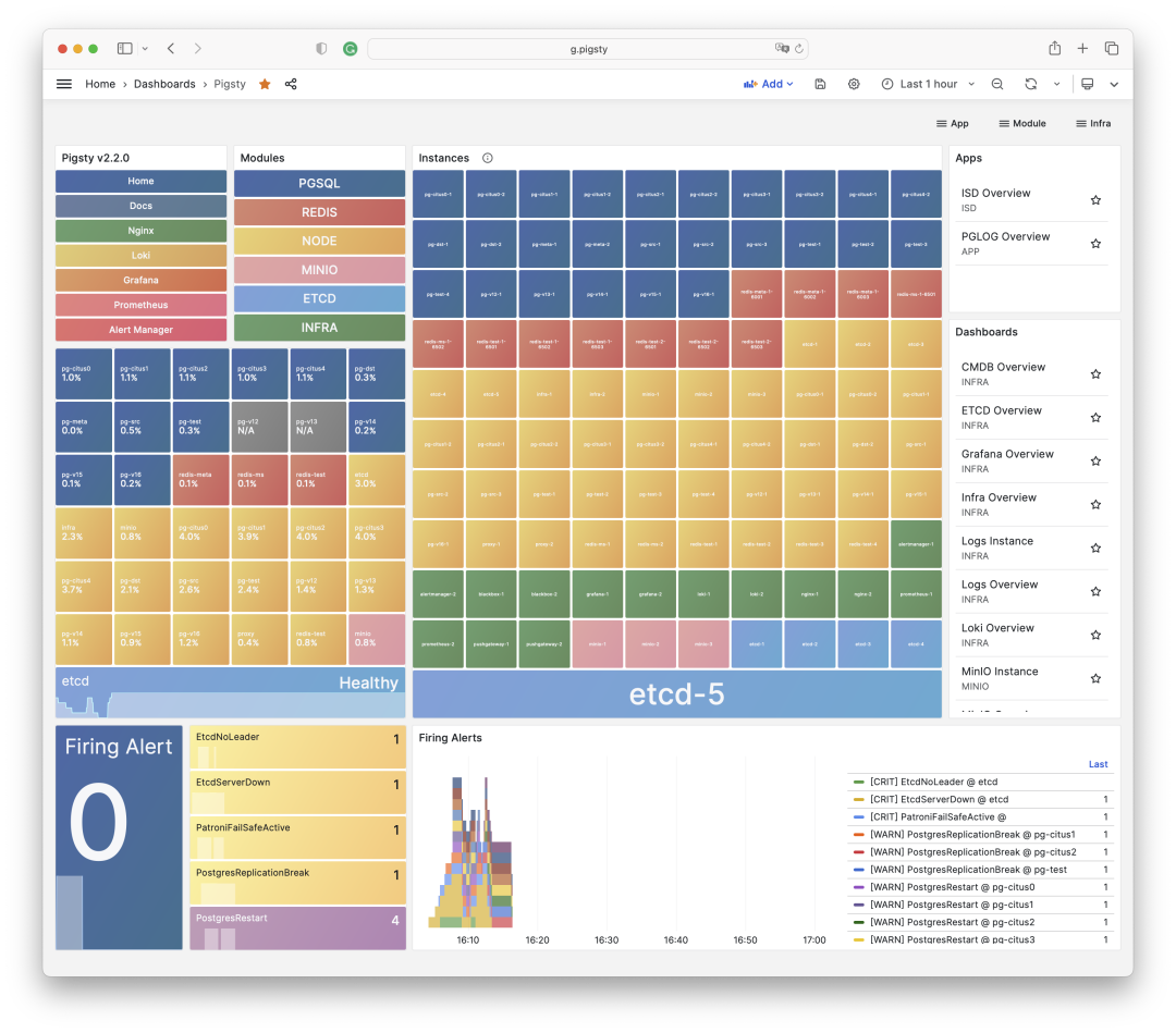 在 Pigsty 中,还有许多关于特定主题的 Dashboard。限于篇幅,关于监控系统的介绍就是这些。最直观的体验方式,就是访问 Pigsty 提供的公开 Demo:http://demo.pigsty.cc ,亲自上手把玩一番。虽然这只是一个4台1C虚拟机的简陋环境,但用来展示Pigsty最基本的监控系统能力已经是足够了。