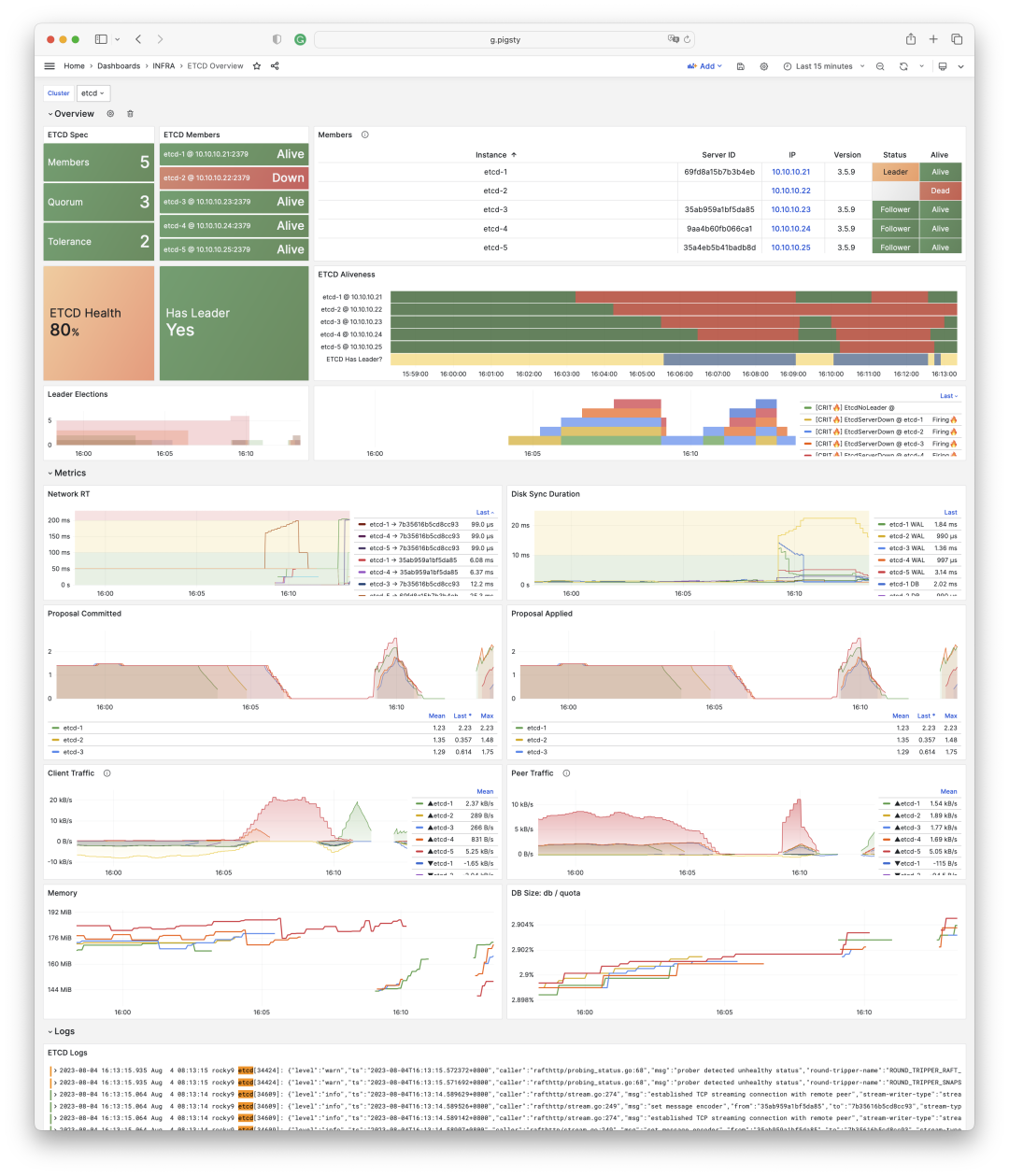 Etcd Overview 则使用 State Timeline 来可视化 DCS 服务的可用性状态。例如下图展现了一个模拟 etcd 故障的现场:在一个5节点的 ETCD 集群中依次关闭各个实例,集群可以容忍两个节点故障,但3个节点故障将导致 ETCD 服务整体不可用(黄色的条转为暗蓝色,代表 ETCD 服务整体不可用)。