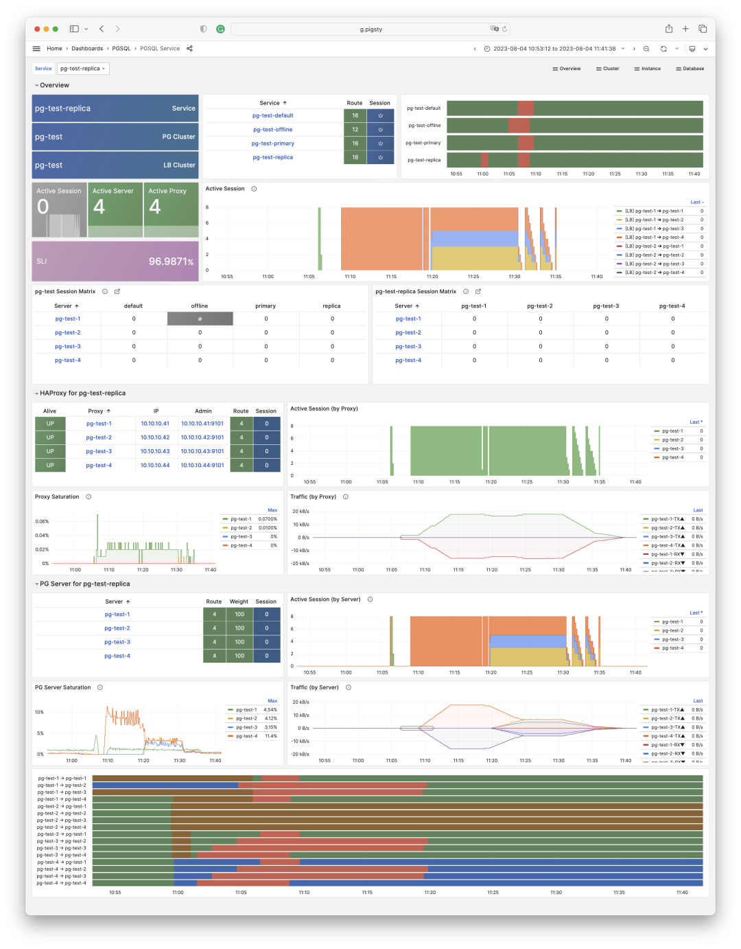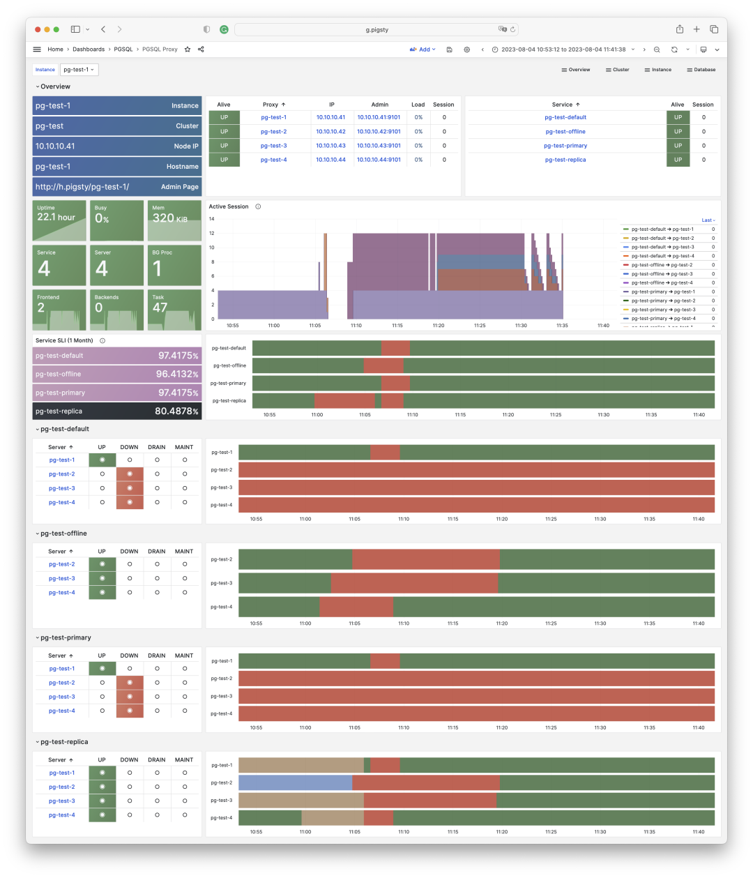 这是 pg-test 集群 1 号 HAProxy 负载均衡器的监控面板,每一个由其承载的服务都会列于其中,展示后端服务器状态并计算 SLI。HAProxy 本身的状态与监控放置在 Node Haproxy 监控面板中。