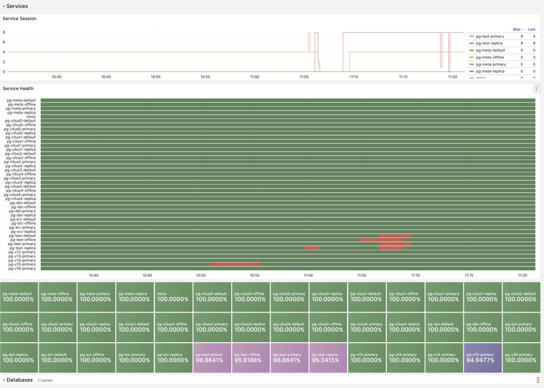在全局总览中,可以看到 Pigsty 中所有数据库服务的整体状态时间线与 SLI 指标。