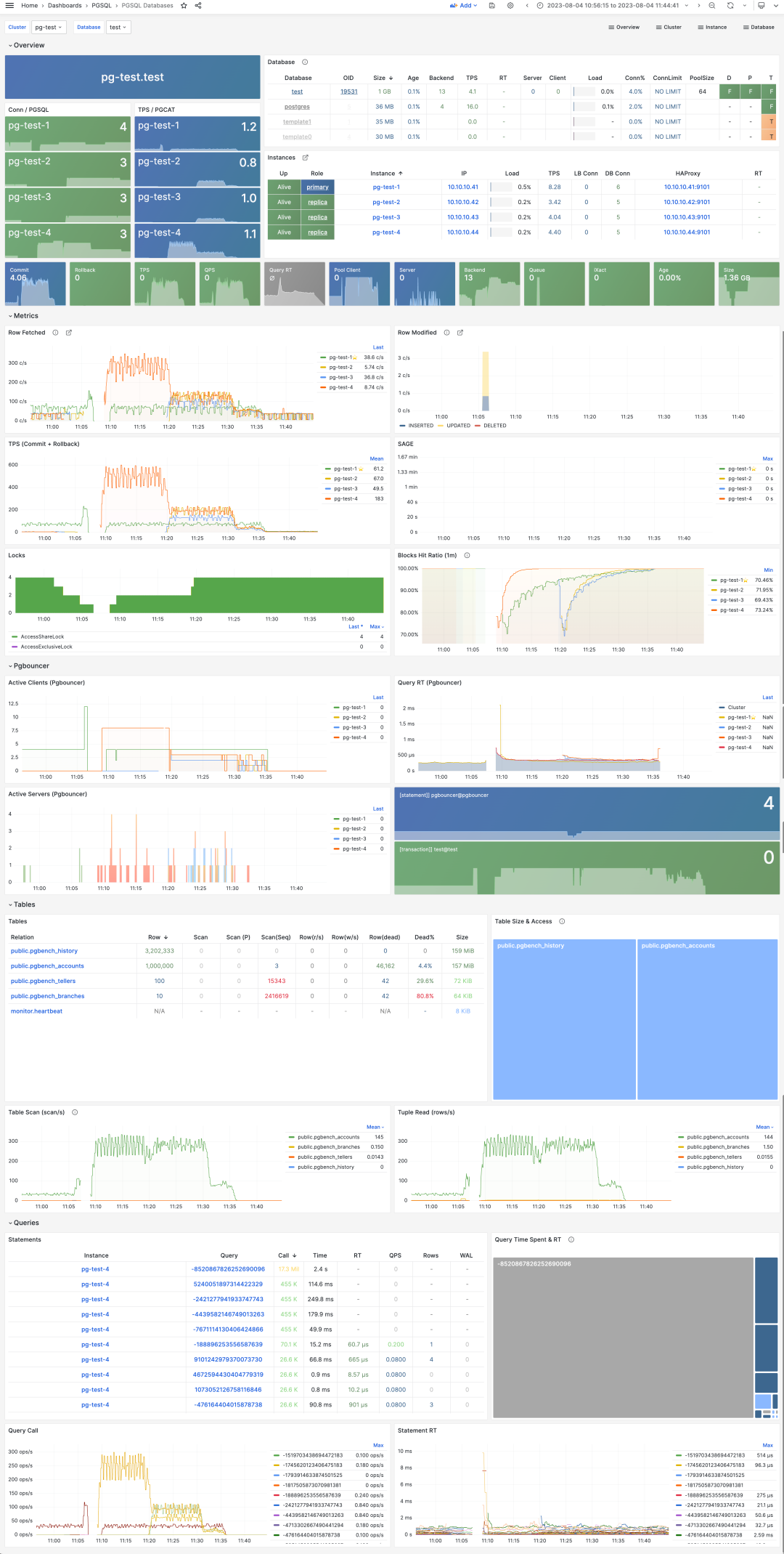PGSQL Databases 展示了集群层面的数据库统计指标。例如,在 pg-test 集群中有4个数据库实例,与一个数据库 test ,而这里就展示出了这4个实例数据库指标的水平对比。