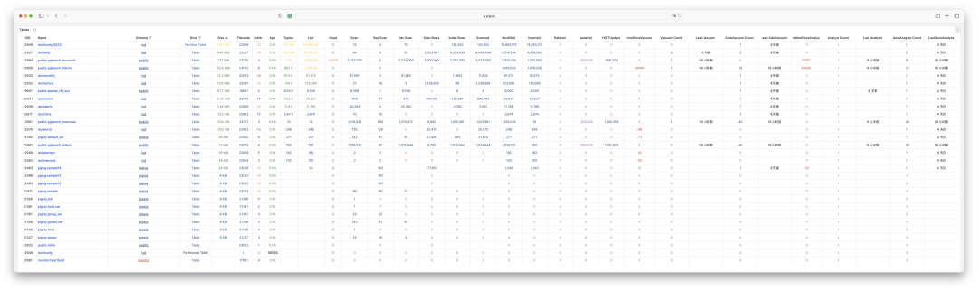 当然,您也可以使用 PGSQL Table 面板,从指标的维度,查阅一张表在任意历史时间段上的关键指标。点击表名即可轻松在两个视角进行切换。