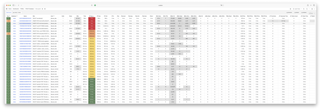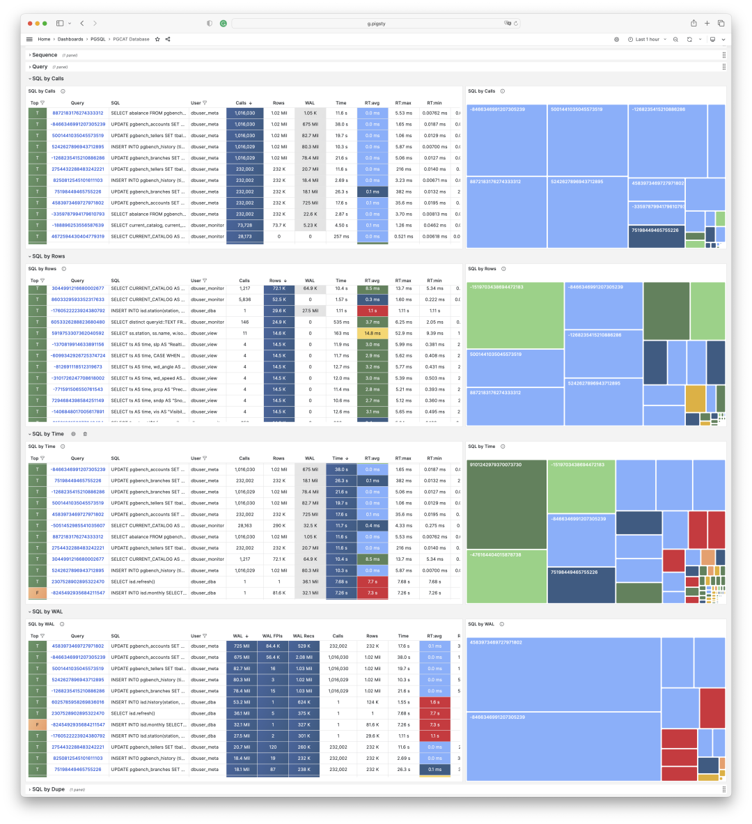 用户可以进一步下钻到单个数据库实例内部的统计,也就是 PGSQL Database 面板。这个面板提供了一些关于数据库与连接池的关键指标,但最重要的是,PGSQL Database 面板提供了对数据库内最活跃醒目的表与查询的索引 —— 这是两类最为重要的库内对象。