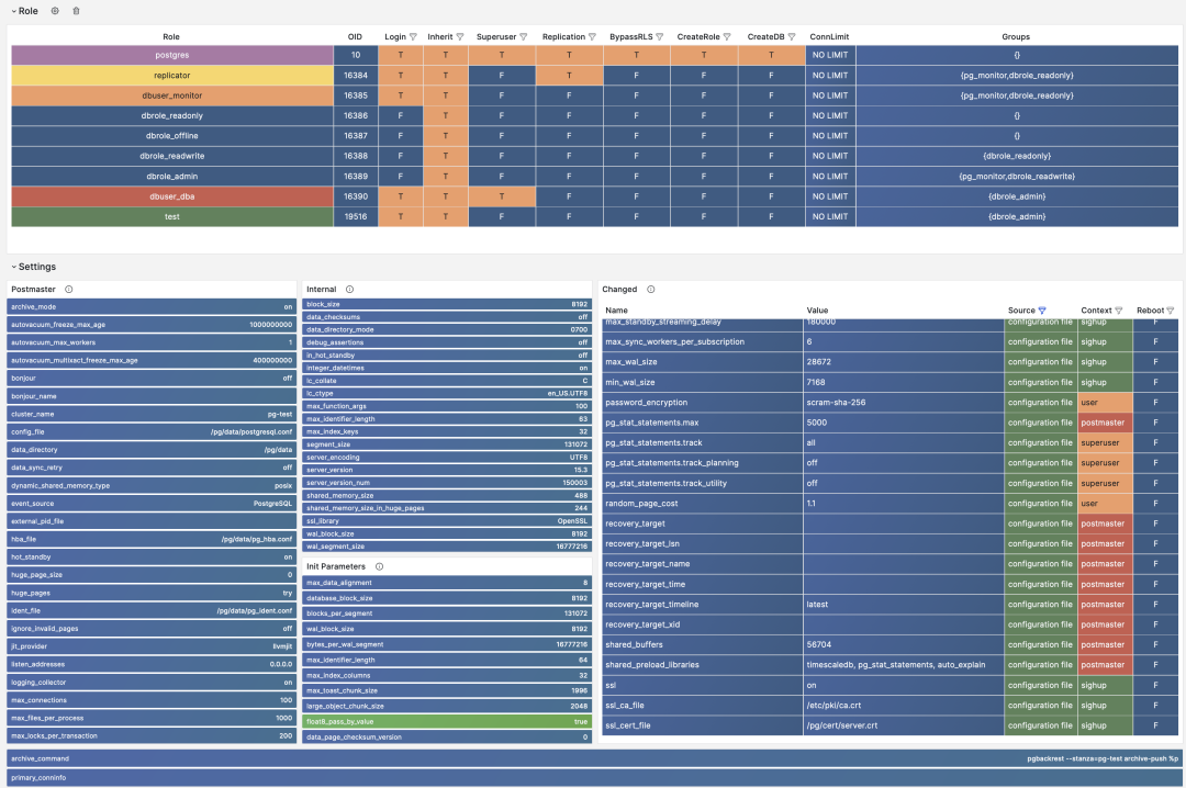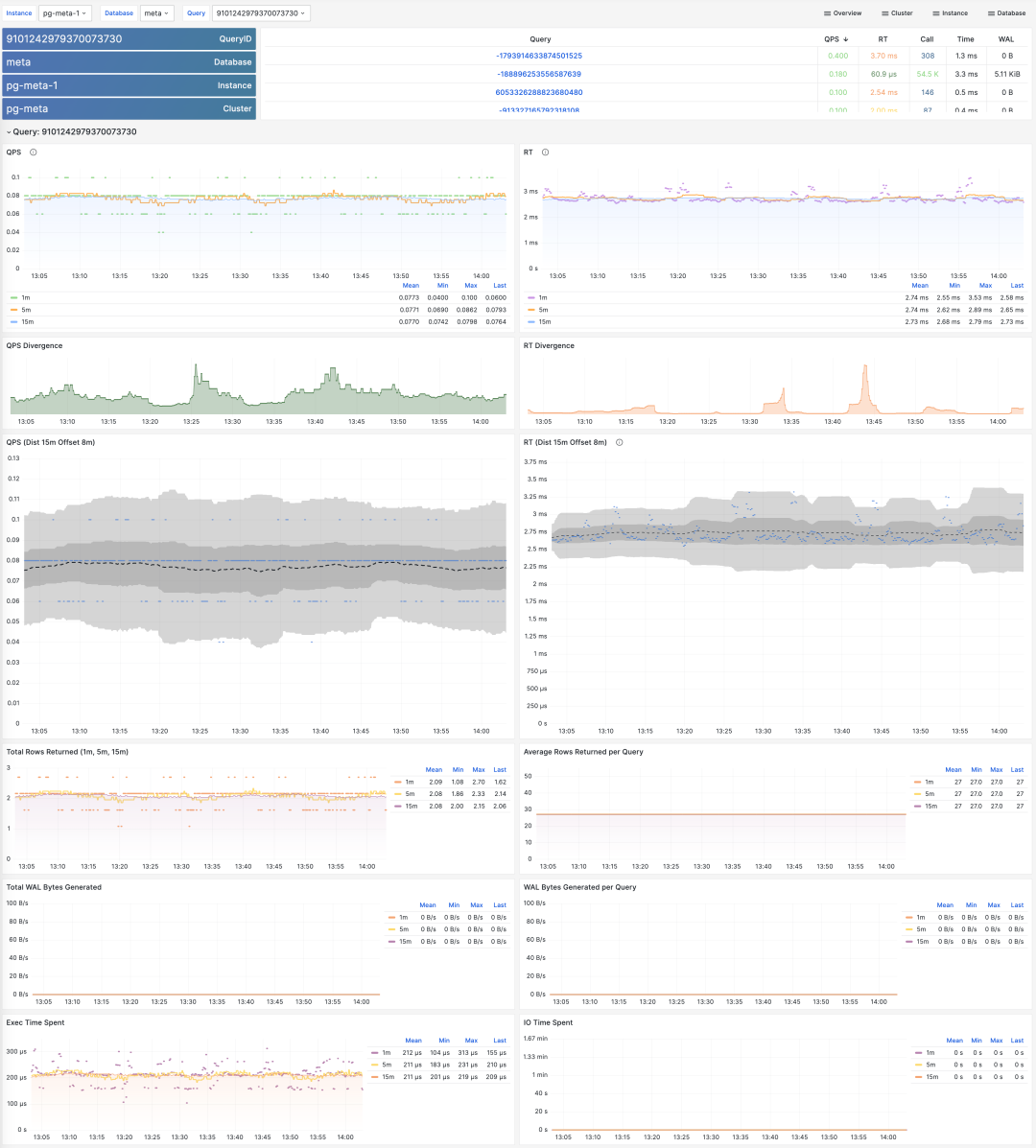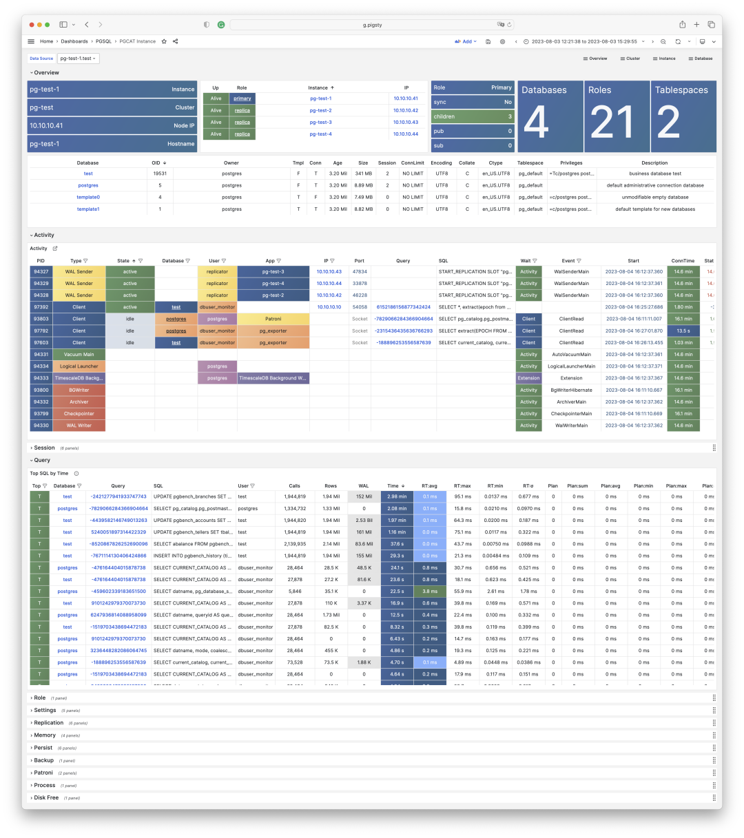PGSQL Instance 展现了一个实例的详细状态,在 v2.2 中也进行了重制。最基本的设计原则就是:不是蓝/绿色的状态才需要关注。这样通过颜色视觉编码,用户可以在事故分析时快速定位一个数据库实例的故障根因。