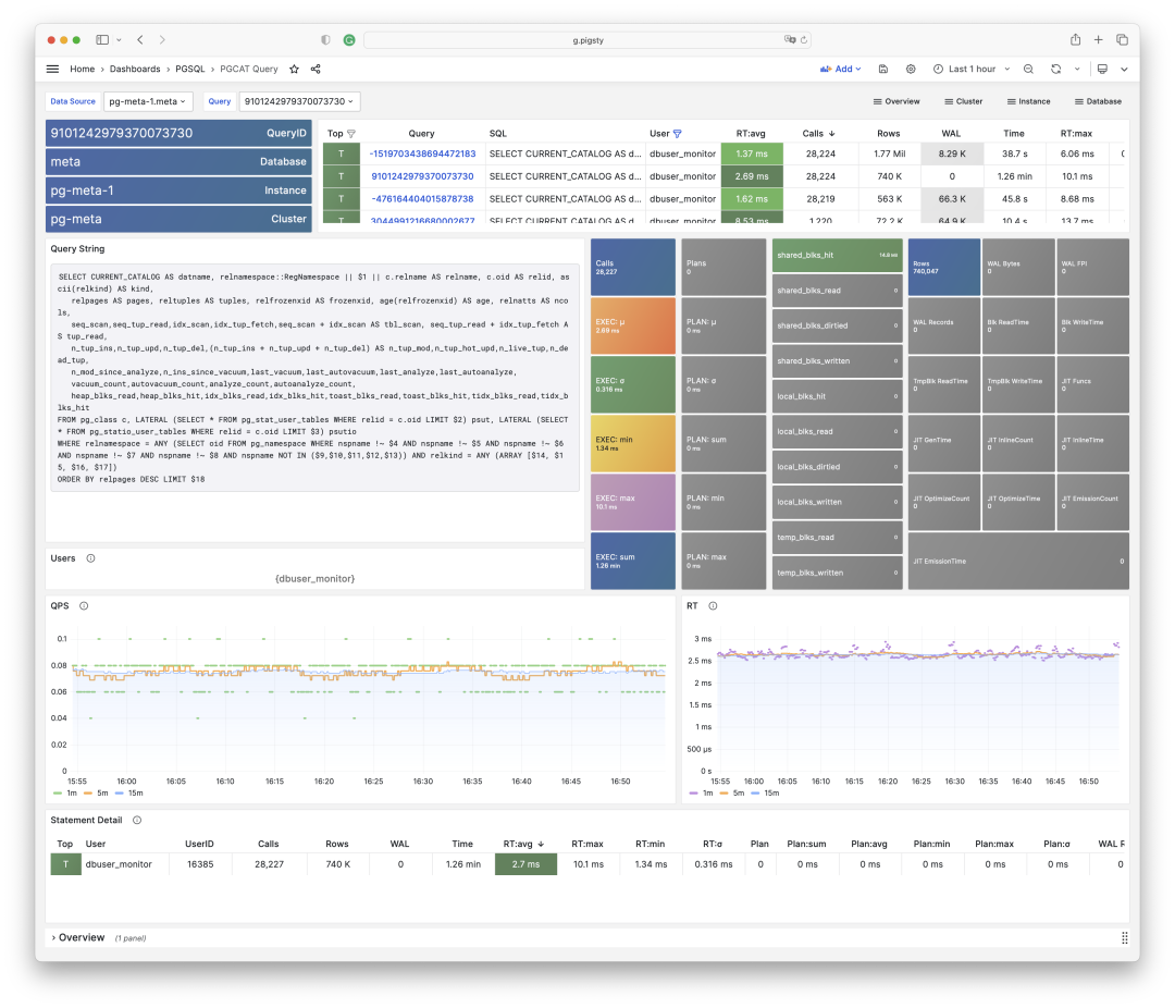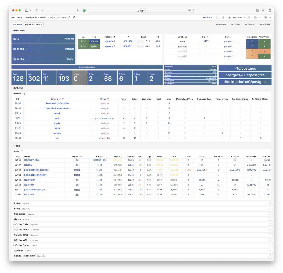 在 Pigsty 中,除了会对数据库服务器进行监控外,也会对数据库服务器所承载的逻辑对象 —— 数据库,表,查询,索引等逻辑。