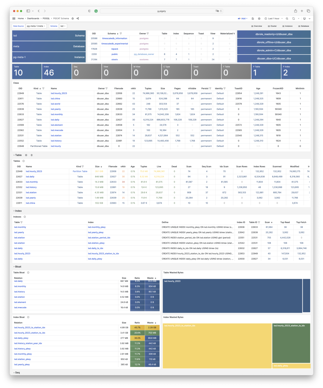 每一个 Schema,Table ,Index 都可以点击下钻,进入更详细的专用面板中。例如 PGCAT Schema,就进一步展现了一个架构模式内的对象细节。