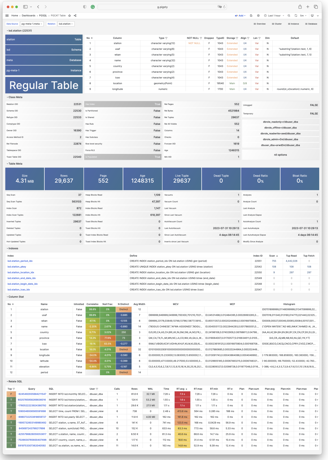 在 Pigsty 中,您可以查阅一张表的方方面面。PGCAT Table 面板可以让您查看表的元数据,上面的索引,每一列的统计信息,以及相关的查询。