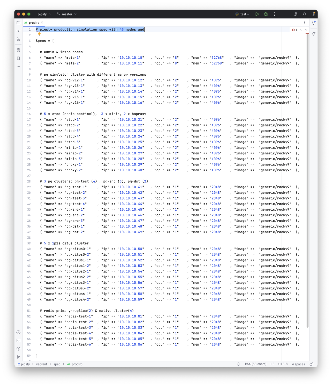 Pigsty 提供了一个基于 Vagrant 与 Virtualbox 的沙箱环境,可以跑在你的笔记本电脑/Mac上,有一个 1 节点的最小版本,和一个4节点的完整版本,用与演示与学习,而现在 v2.2 中又多了一个 42 节点的生产仿真版本沙箱。
