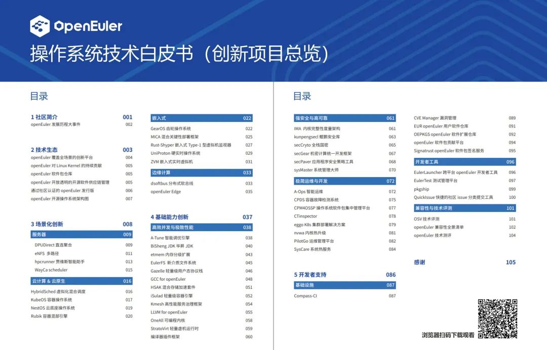 2023年,openEuler进入正循环自加速的发展阶段。我们将社区伙伴的优秀成果、社区技术生态、创新项目等收录进《openEuler操作系统技术白皮书(创新项目总览)》(以下简称:白皮书)中,并发布在社区官网上,以呈现openEuelr社区生态面貌。