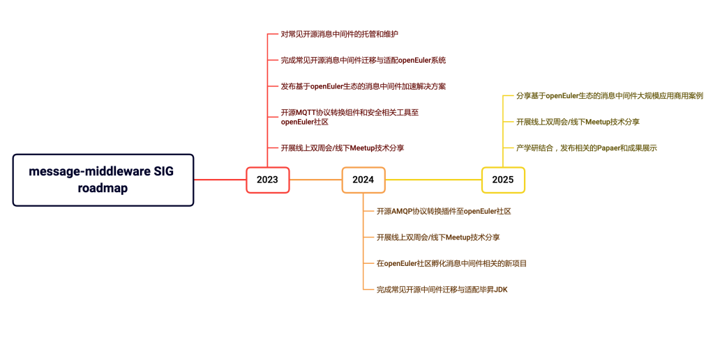 经openEuler 技术委员会委员(TC)讨论决定,message-middleware SIG在社区成立并运作。该 SIG 组由中国移动云能力中心牵头发起,并主导制定该 SIG 组的相关工作职责、内容和未来发展规划。