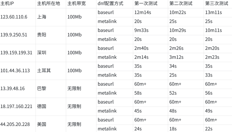经过一个月的调试,Metalink服务性能得到进一步的提升。开发者在新版本(openEuler-22.03-LTS-SP2)的dnf配置文件中添加metalink配置项后,服务会自动选择最优站点,提升软件下载速度。测试结果显示,在添加metalink配置项后,国内的下载速度有20~30倍的提升;欧洲和北美有50~100倍速度的提升。后续openEuler将在更多版本中添加metalink配置项,保证用户在openEuler下载软件时更高效,稳定。