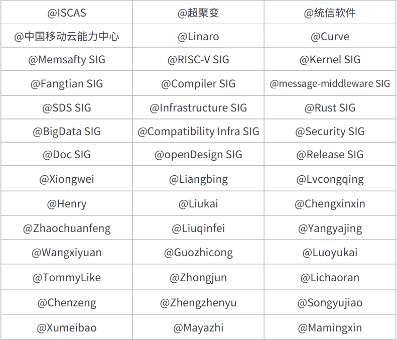 因为大家的辛勤贡献,openEuler的每一天都发生着好的事情。小编限于视野和能力,难免有所遗漏,在此表示歉意。同时,衷心感谢社区朋友、开发者们以及openEuler SIG组成员的贡献: