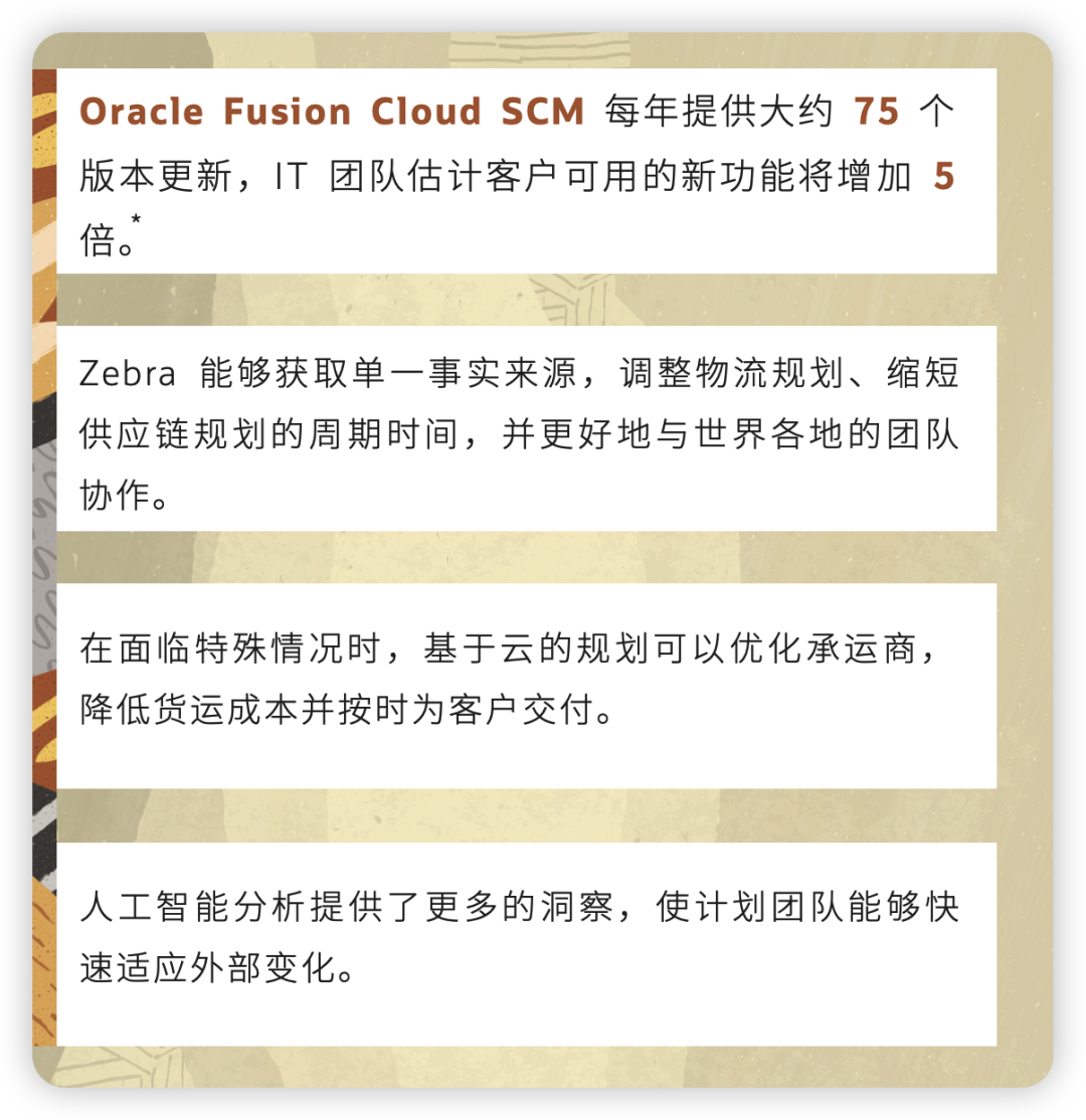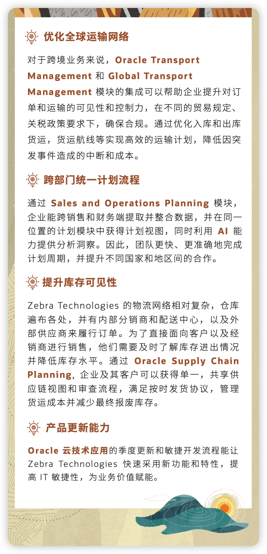 Zebra Technologies 选择了包括供应链计划 (Supply Chain Planning)、物流 (Logistics) 解决方案在内的 Oracle Fusion Cloud SCM,以满足以下要求: