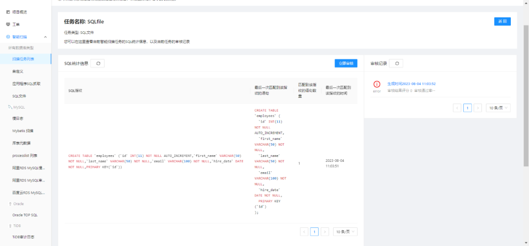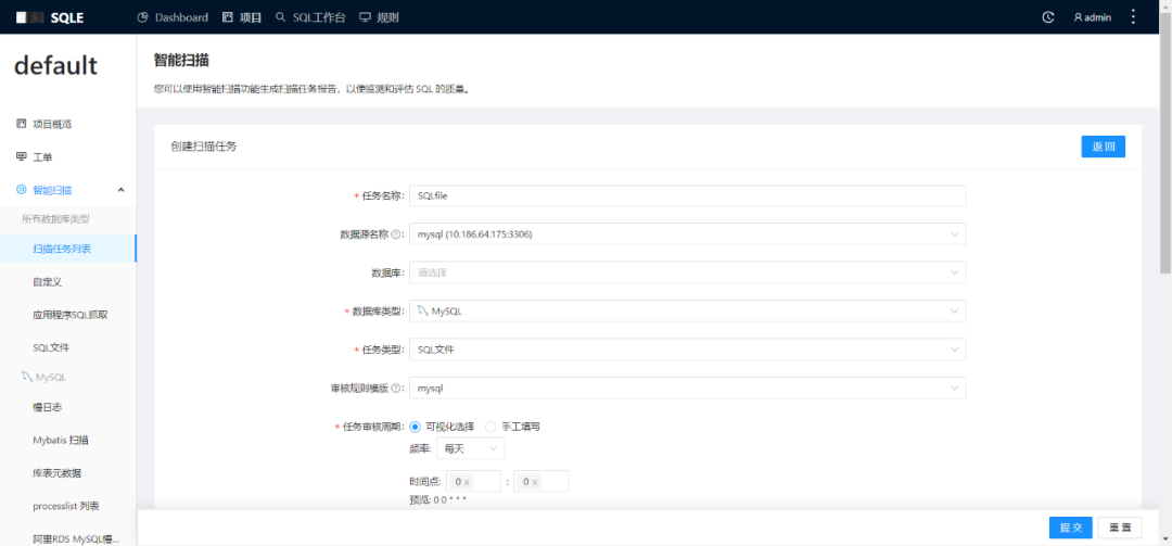 平台新增扫描任务,当前支持对 SQL 文件进行扫描。利用该扫描任务,用户可以在批量执行 SQL 前发现潜在的安全漏洞、提高数据库性能及数据库开发质量。以下是简单的功能试用: