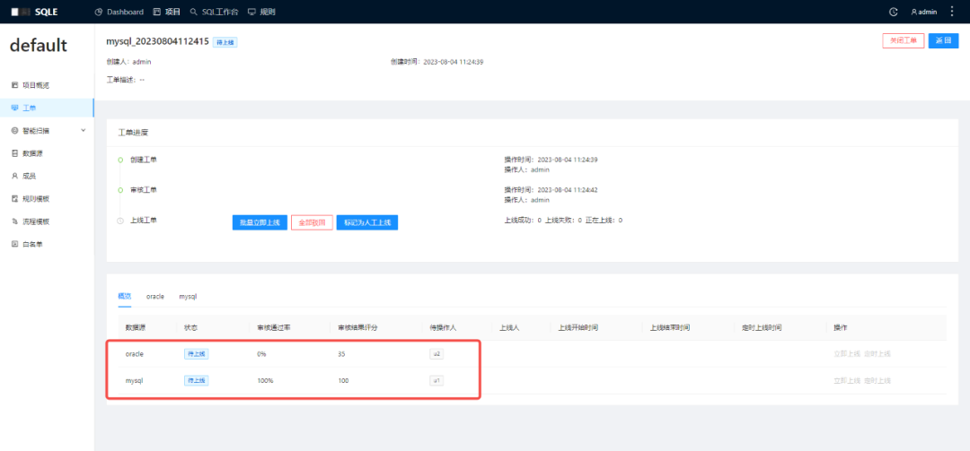 3. 创建一则工单,其中包含对 MySQL 实例及 Oracle 实例的 SQL 操作。审核通过后,查看待操作人分别为该实例上具有上线权限的成员。