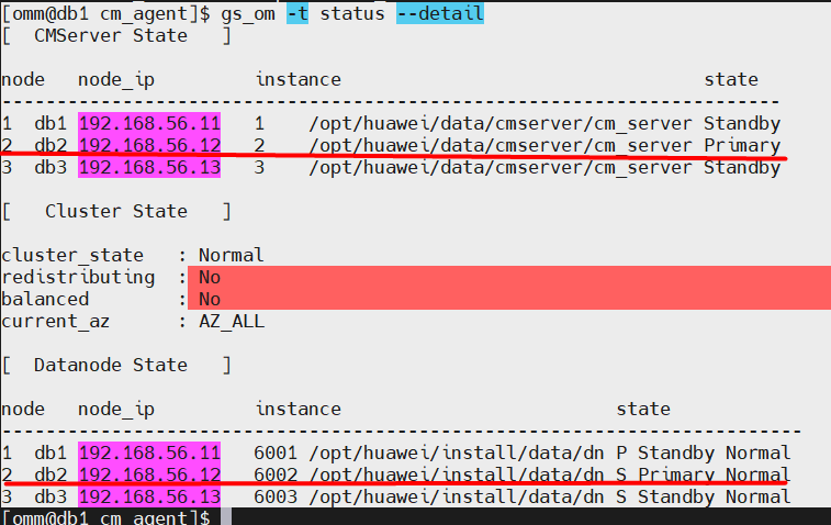 1 db1 192.168.56.11 1 opt/huawei/data/cmserver/cm_server Standby