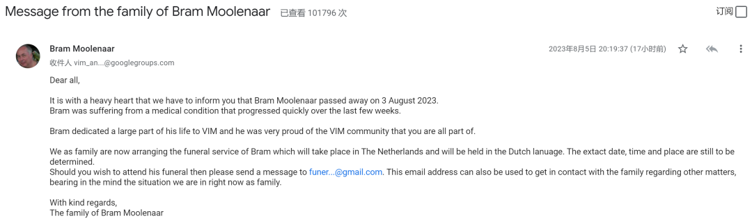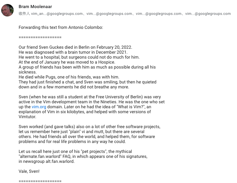 就在去年 2 月 20 日,Vim 项目的重要维护者 Sven Guckes 在柏林去世。Moolenaar 当时还发布了一封邮件以表痛失知音,并宣布要将 Vim 的下一个大版本 9.0 献给这位挚友。