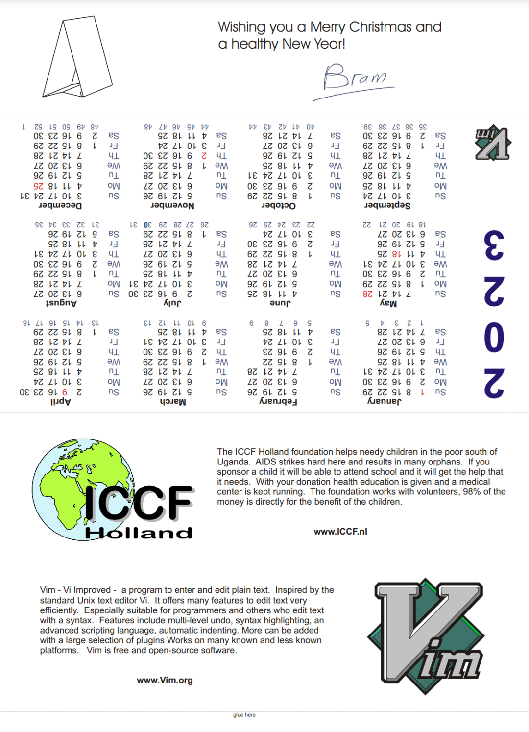 为了记录 2023 年的生活,他还在个人主页上晒了自己制作的日历:由一张纸制成的桌面日历。在折叠后,一侧显示 12 个月的日历。另一面是关于 ICCF-Holland 和 Vim 的简要信息。