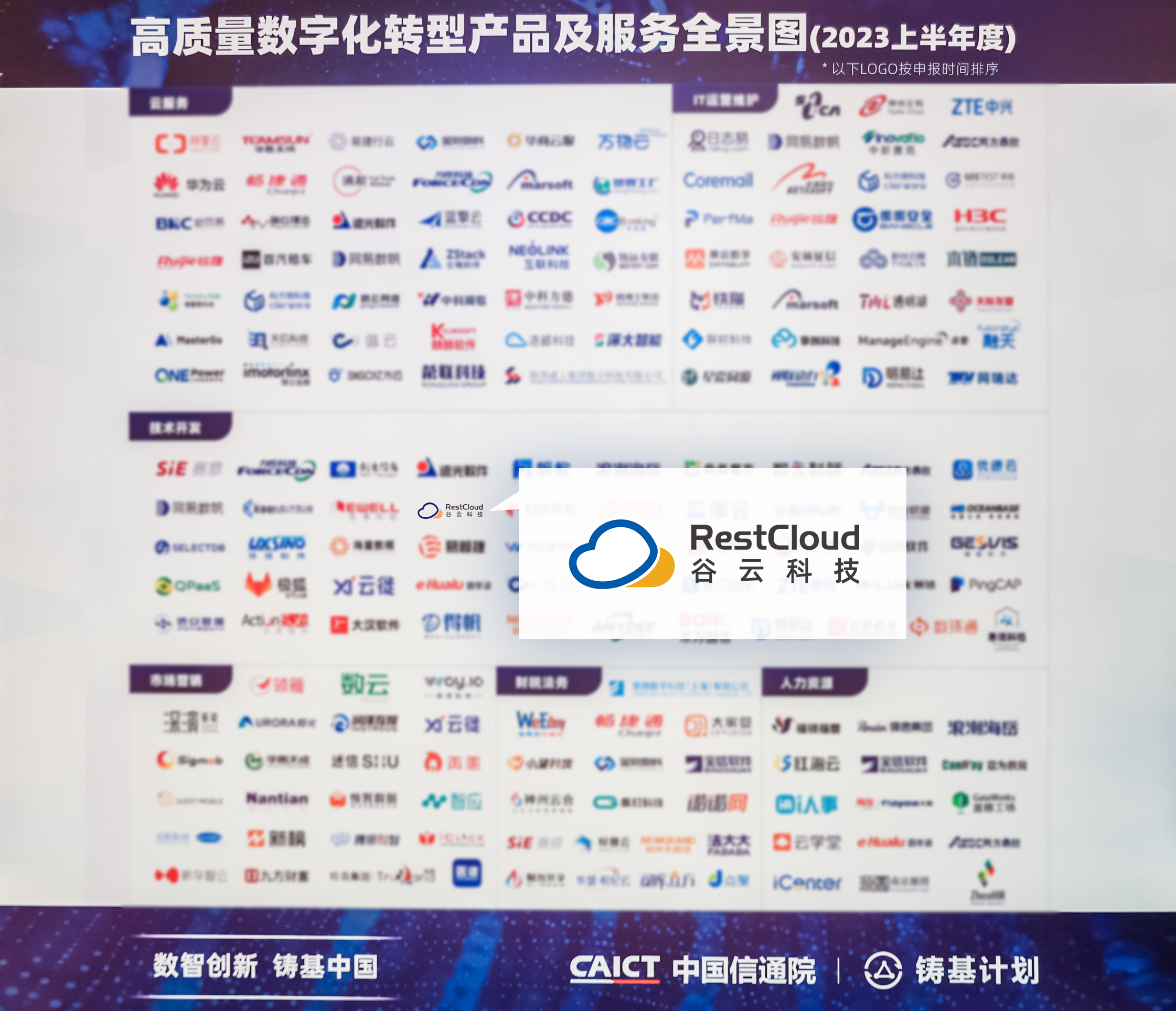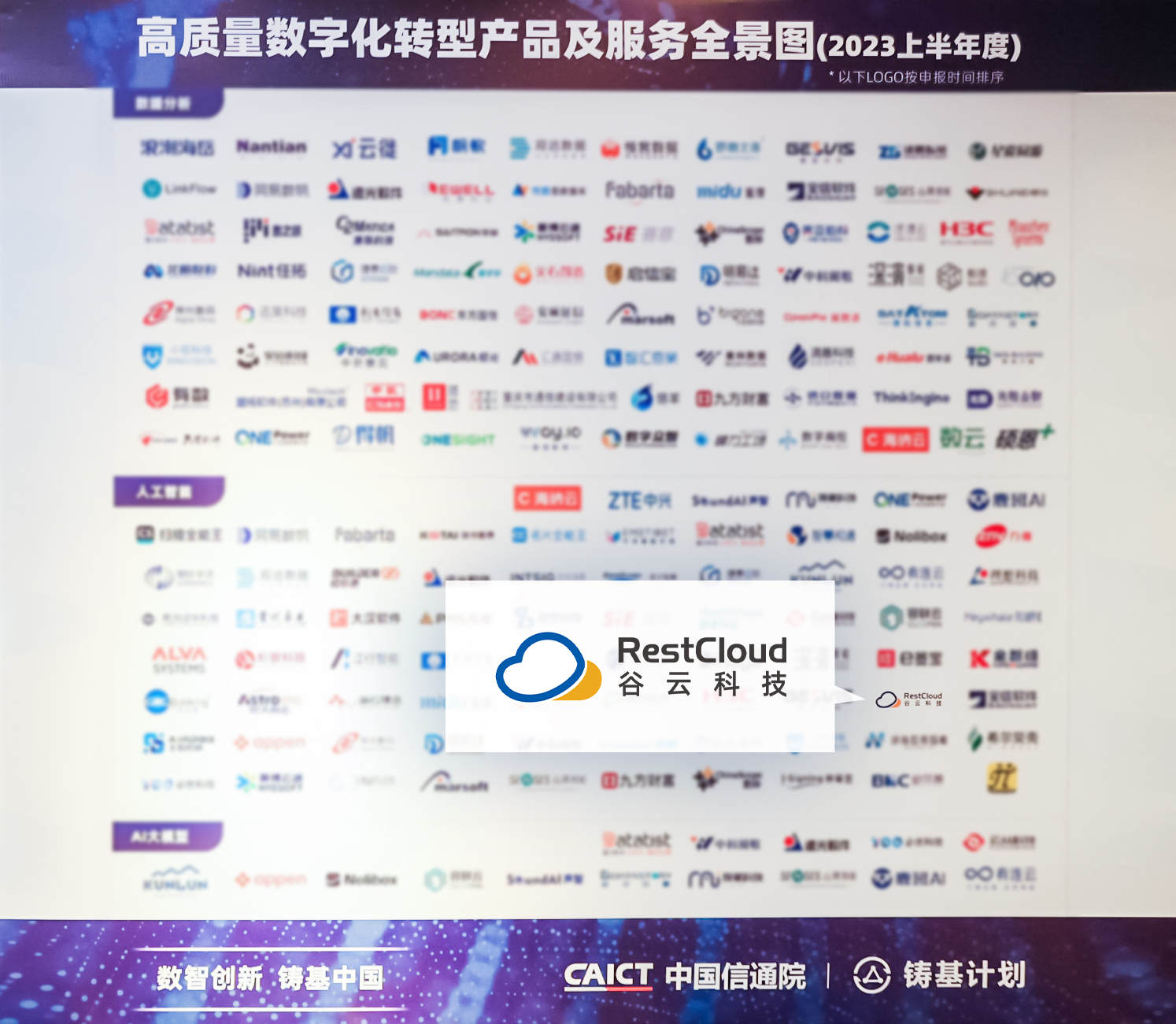 会议上,备受瞩目的“铸基计划”《高质量数字化转型产品及服务全景图(2023)》正式发布。谷云科技旗下的一站式混合集成平台iPaaS、智能全域数据集成平台 (ETLCloud)产品通过多方面评估,成功入选中国信通院《高质量数字化转型产品及服务全景图 (2023)》